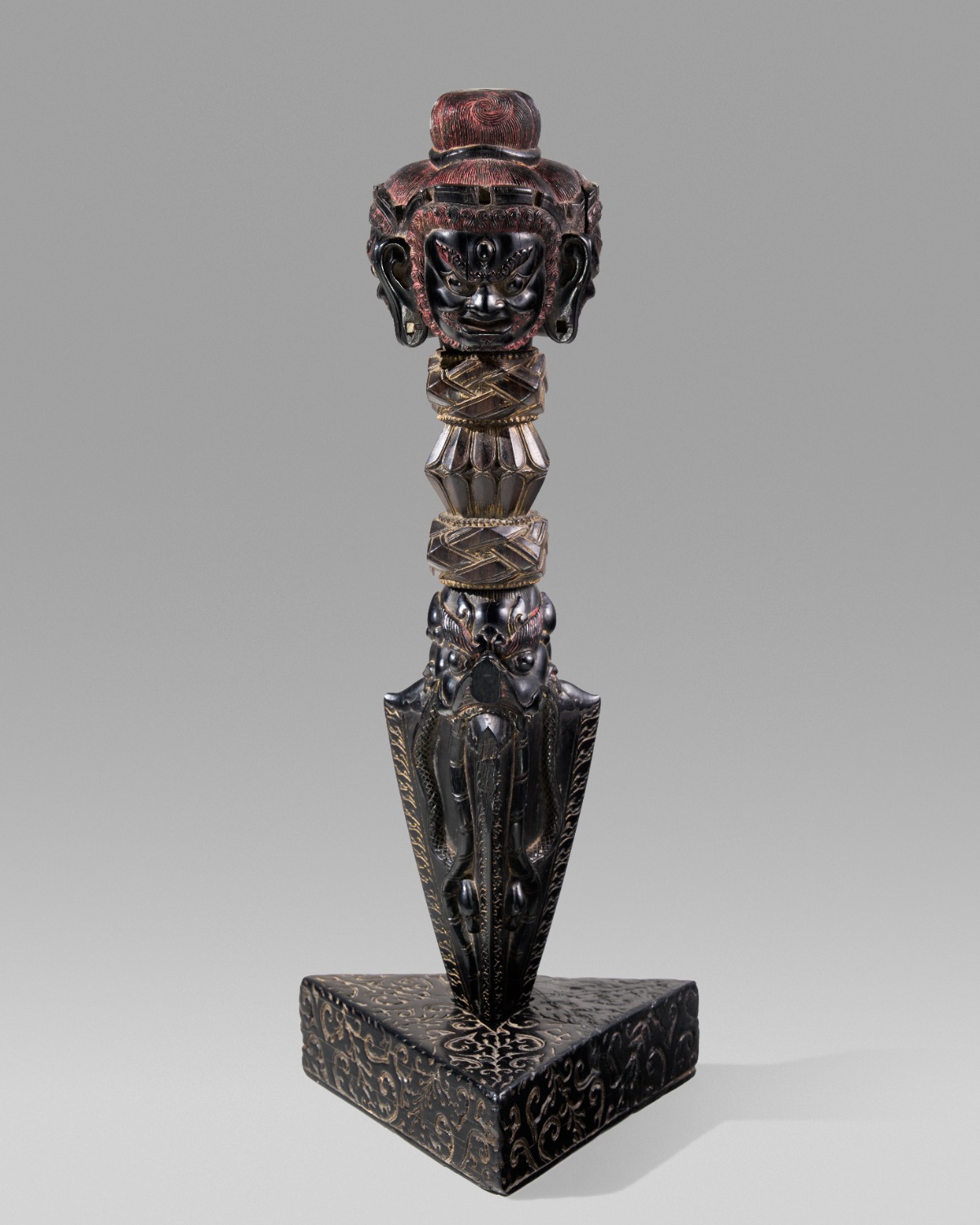 金刚镢,又称降魔杵、普巴杵。是藏传佛教与密宗体系中最具力量感与象 征性的法器之一。它不仅是修行与仪轨的工具,更是一种浓缩了文化、宗教与哲 学的艺术形象 。这件出自 15 世纪明代永乐宫廷的金刚镢,结构分为三段:上下 两段以乌木制成,中段则以紫檀雕刻。单从材质的组合来看,它已超越了一般实 用层面的考量,承载了宫廷的威仪、佛教的深义与时代的精神象征 。 乌木与紫檀,都是明初宫廷最为珍贵的木材。乌木因为生长缓慢、木质致 密而坚硬,常常被视为“可制神物”的理想之材。材质所散发的深沉气息与黝 黑的表面,也给视觉带来了肃穆与凝重的感受,同时也构建出了一种“稳固支撑” 的力量感,也为法器整体确立了庄严的基调。 紫檀则更为稀罕。紫檀木的主要产地在印度、东南亚,在当年需要通过海 外贸易才能获得。明成祖朱棣于永乐三年(1405 年)六月派遣宦官郑和、王景 弘大规模下西洋后,于永乐五年九月返航时船队才首次带回紫檀木 。据记 载,当时运输艰难,数量极少,因而紫檀在永乐时期几乎只用于皇家御用之 器,是地位与权力的象征 。 金刚镢的造型充满象征语言,层层递进 。上端雕刻为三面愤怒护法相。护 法怒目圆睁,发髻卷曲,发髻上的红彩,象征着熊熊燃烧的烈焰。三面愤怒相 象征着对“三毒”(贪、嗔 、痴)的摧破 。它们并非纯粹的恐怖形象,而是力量 与慈悲并行的化身:摧毁幻象、破除执着、守护法门。法器所体现的“刚毅之 美”并非冷峻,而是一种力量与慈悲并行的状态——正如护法面愤怒而不恶意。 这个部分为乌木雕刻。 中间为上下对称的扭结和莲瓣,这个部分有多种象征意义的解释。“北藏” 的一部宁玛派经文中说:“轮回和涅槃被封在手柄任何一端的大纽结里。手柄的 八个面因一切创生而熠熠生辉。”同样,这种上下左右交织、首尾相连的符号,也 象征着佛法的无尽延续,没有开始也没有终点,就像轮回与因果的循环,又像智 慧与慈悲的交融,也意味着降伏之力并非孤立的暴烈,而是根植于无尽的佛智 来源:Rossi & Rossi, Ltd., London;European Private Collection, acquired in 1991 著录:Nathalie Bazin, commissaire, Rituels tibetains. Visions secrètes du Vème Dalaï Lama (1617-1682), Paris, Editions de la Réunion des musées nationaux, 2002, pp. 153-154, cat.no. 119; Michael Henss, Buddhist Ritual Art of Tibet, Stuttgart, 2020, p. 179, fig. 206. 与法界的循环。扭结中间为上下对称的莲花瓣,莲花“出淤泥而不染”,是佛教 最普遍的清净与觉悟的象征 。当莲花以台座的形式出现在造像上时,意味着一 切智慧与慈悲的显现都以清净心为基础 。当莲瓣在金刚镢中的出现,强调即使 在忿怒相、毁灭性象征的外表下,其最终的指向仍是清净、解脱与智慧,所有降 伏的行为最终都要安住于清净的智慧与慈悲心。这两种纹饰结合出现在金刚镢 的中段,就像在提醒使用者:力量只有安住在清净与智慧中,才不会堕入破坏 与嗔怒的业力;而一切清净与智慧,也要在轮回无尽的缘起中体现出来 。这个 部分为紫檀雕刻。 随着视线下移,扭结的下方为张开大口凸出镢刃的摩羯。摩羯在佛教艺术 里,摩羯口中常常吐出莲茎、宝珠或其他器物,象征“无尽生发”。在法器(如 金刚杵、金刚镢等)上,摩羯的张口象征着“法力的泉源”,一切佛法智慧从此 涌现 。在现代语境中,摩羯就像一种“精神转化器”。它的张口既像“黑洞”,能 吸纳恐惧 、混乱;又像“喷泉”,从吞噬过的痛苦中,吐出新的智慧与创造力。 摩羯吐出的镢刃为三棱锥形态,刃边刻有燃烧的火焰,尖锐的镢刃象征着对“三 毒”(贪、嗔 、痴)的刺破 。在现代生活里,这启发着我们要学会用清明的心 智,去刺破种种幻象,比如消费主义制造的欲望泡影、社交媒体的虚拟比 较、亦或是情绪的迷雾等等。镢刃每面上雕刻有缠绕的蛇,蛇在佛教中常常与 原始力量、灵性、欲望等相关联 。镢刃上的蛇代表被驯服和转化的负面能量。 它缠绕在法器上,意味着这些力量不再是破坏性的,而是转化为护持正法的能 量。在密教象征中,蛇的蜕皮也象征着更新、觉醒与智慧的再生。这个部分为 乌木雕刻。 金刚镢的尖刃下方有一个刻满卷草纹的三角形底座,尖刃的插地动作,像 是一个强烈的象征:钉住动荡,稳定当下。在密教曼荼罗中,倒置的三角形往 往代表“本初母”(空性、智慧的母体),是宇宙能量的源泉 。镢刃插入三角形底 座,也可理解为“智慧之刃进入空性”,由此生发出转化与护持的力量。三角形 的形制在建筑与图像学中也有“稳定”“坚固”的意味 。因此,用现代语境来理解的话,蛇就像我们的本能、情绪与潜在的破坏 力;三角形底座像是我们的根基 、现实生活中的秩序与稳定;镢刃插入其中,像 是把修行的力量、把“混乱”转化成“秩序”,把“欲望”转化成“智慧”。就像心 理学里“阴影的整合”:不是消灭内心的蛇,而是让它被钉入稳定的底座,转化 成生命力量的一部分。 此把金刚镢为 15 世纪永乐时期的作品,但从塑造风格而言,依旧延续有 14 世纪佛教艺术中的粗壮与厚重感。立体的镢身蕴含着饱满的情绪张力,细腻 的雕刻、打磨凸显着工艺的精细,两种材质的运用凸显着其重要性,材质所散 发的肃静光泽与造型的视觉张力相结合,使整体形成了一种沉稳如山的磅礴气 势。 永乐时期,明成祖朱棣对藏传佛教极为推崇,大量下诏铸造、制作