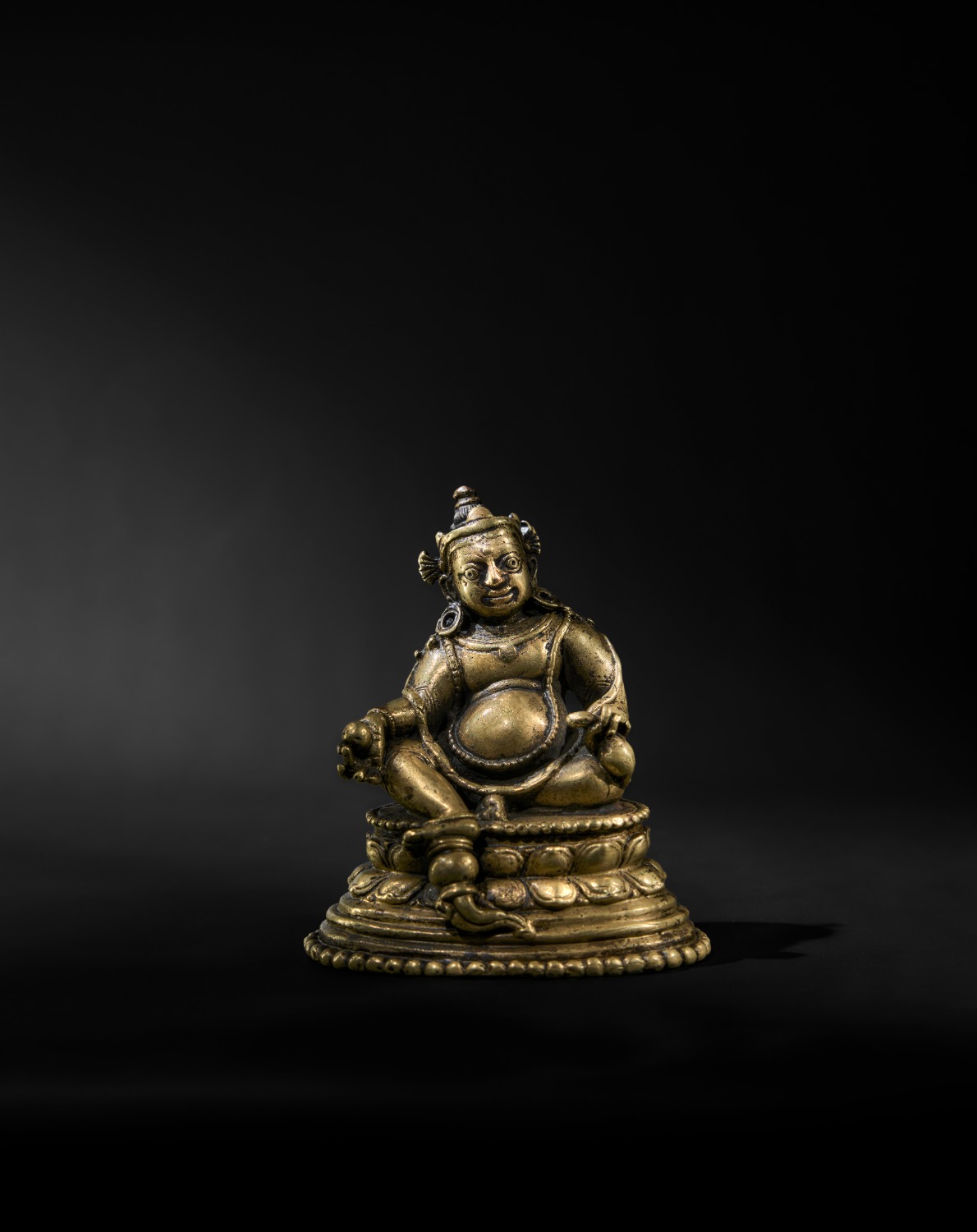 第一次看到这尊黄财神造像时,我是被吸引住的。会有种直觉——这不仅 仅是一尊财神像,更像一位威严的将军,一位充满力量的护法,甚至还是一位 充满福相与富贵气息的神祇 。祂的姿态挺拔,饱满而端正,完全符合我们心 中对“财神”二字的想象和期待。因为在藏文化中黄财神,从来都不只是象征 财富的神祇那么简单,祂还是一位发了大愿、具足威德、象征护佑的护法神。 从艺术风格来看,这尊造像是一件 12-13 世纪西藏受到帕拉艺术风格影 响的一件作品 。在业内,往往一件作品如果出现了风格的融合,而且做得很出 色,人们第一反应通常是:“这可能是外来匠人做的。”因为传统上,大家会觉 得西藏本土匠人在那时候对于有文化融入的作品是不太容易处理好的。但由 于历史很难回望,很多事都无法过于绝对。所以,往往我更提倡不论是外来工 匠还是本土工匠,我们应该更多的注重作品本身的最终呈现 。 像这件作品,我觉得匠人不只是简单的“风格借用或者风格融合”,我更 愿意说,这是某位匠人通过深刻的理解 、消化之后,创造出来的属于匠人他自 己的艺术语言。这种语言既熟悉又新鲜,有继承 ,有变化,带着独属于他自己 的思考。 于时代背景而言,这件黄财神诞生在后弘期初期阿底峡入藏弘法之后,那 段文化交流频繁、艺术风格多元交织的时期 。当时帕拉艺术通过匠人、典 籍、法脉一路传入了青藏高原。随着 12 世纪中后期帕拉王朝的衰亡,西藏逐 渐成为大乘佛教、尤其是密宗的核心传承地 ,也因此迎来了一波新的文化融合 以及工艺流动。这尊黄财神,便是在这样的时代背景中诞生的。这件作品既 有帕拉艺术中结构严谨、线条流畅的优点,同时也将西藏本土的粗犷、阳刚和 那种山一般的力量感融入了其中,呈现出了一种“体积之美”。 财神发髻高高束起,头戴三叶冠,佩戴圆形耳铛,耳后后装饰有帕拉风格 常见的扇形冠结。脸型略方中带圆,双眼怒睁,但由于脸部五官的动态并没有 那么大,只是微微的,既给人一种护法的正气之感,又不会产生那种令人不安 的恐惧,反而让人感受到被保护的安心。 财神佩戴项链、璎珞、花环,下身是刻有细腻花纹的裙裤 。祂一手拿着 吐宝鼠,一手持摩尼宝珠 ,一脚踩着象征财富的圆形宝瓶 ,悠然地坐在莲台之 上 。整个坐姿既稳重又挺拔 。不论从正面或侧面看,形体饱满、宽厚 、结 实,且头、胸、手臂、腿部 、腰部等肢体都能看到明确区分与联系,转折自 然,形面之间起伏得当,不突兀 、不混乱,没有松散或空洞的感觉 。在整个坐 姿中,肚子的部分也很突出,圆圆的形状像球体一样饱满,轻轻地落在大腿 上,那种“福气满满”的视觉印象,是非常典型的黄财神形象特征,同样也使 得作品,给人“座得住、压得稳”的感觉 。这种由不动如山的气质所带给我们 的体积之美的构成,是经过匠人的反复观察和构造而来,才会使得作品既符 合这个题材想说的话,又具有审美的节奏与秩序。 同样,莲台也值得一提 。莲台是帕拉风格中常见的大型宽叶莲瓣设计,莲 瓣排列整齐、大气 、节奏明快 。上下缀满了连珠纹,一圈大、一圈小,层层递 进,整个莲台像一个层层递进的梯形结构,于视觉和结构上都增强了稳定感和 庄严感 。 王朝闻老师曾强调,“雕塑的体积感和量感,是一种体现雕塑实体性与审 美逻辑的内在因素,而非尺寸上的表面张扬。” 而这件财神造像就非常的符合 这句话,虽然尺寸不大,但在视觉心理上,且并不亚于一块大石头般的厚 重、沉稳 。匠人对实体存在的理解 、对形体结构的把握、对空间节奏的感 知,以及对形式与精神统一的追求达成了统一,很是难得。